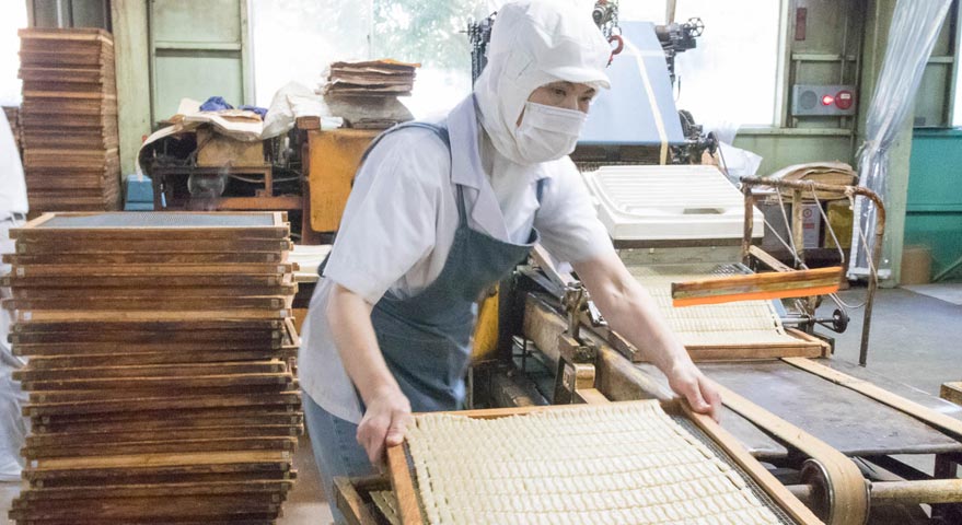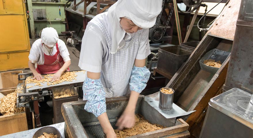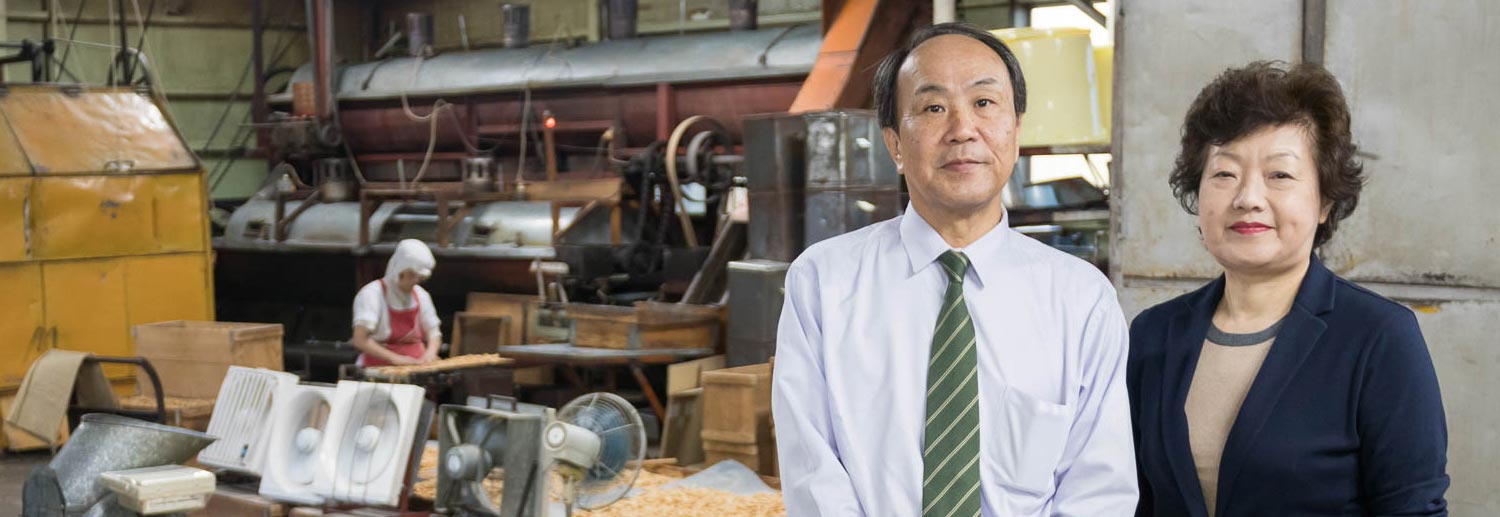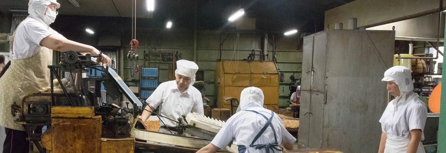 新野屋初代は明治の頃に東京でくろ羊かんの作製を学び、新潟に帰ってきました。でも、和菓子に欠かせない砂糖は当時高級品。羊かんは富裕層向けの製品になってしまいます。子どもが日常で食べられるお菓子を作りたい。そんな夢を持っていた初代は名物「網代焼」を作製しました。新潟のお米を活かした、安価でおいしい地産地消の米菓です。「網代焼」がどうして魚の形をしているのかとよく聞かれますが、これは形を重んじる和菓子職人の感性ならではですね。「網代焼」の数年後に作製した「幸福あられ」がふわりと膨らんだオレンジ色をしているのも、和菓子職人がイメージする幸福を表現しています。和菓子職人の感性で米菓を作る。それが新野屋の伝統なんです。